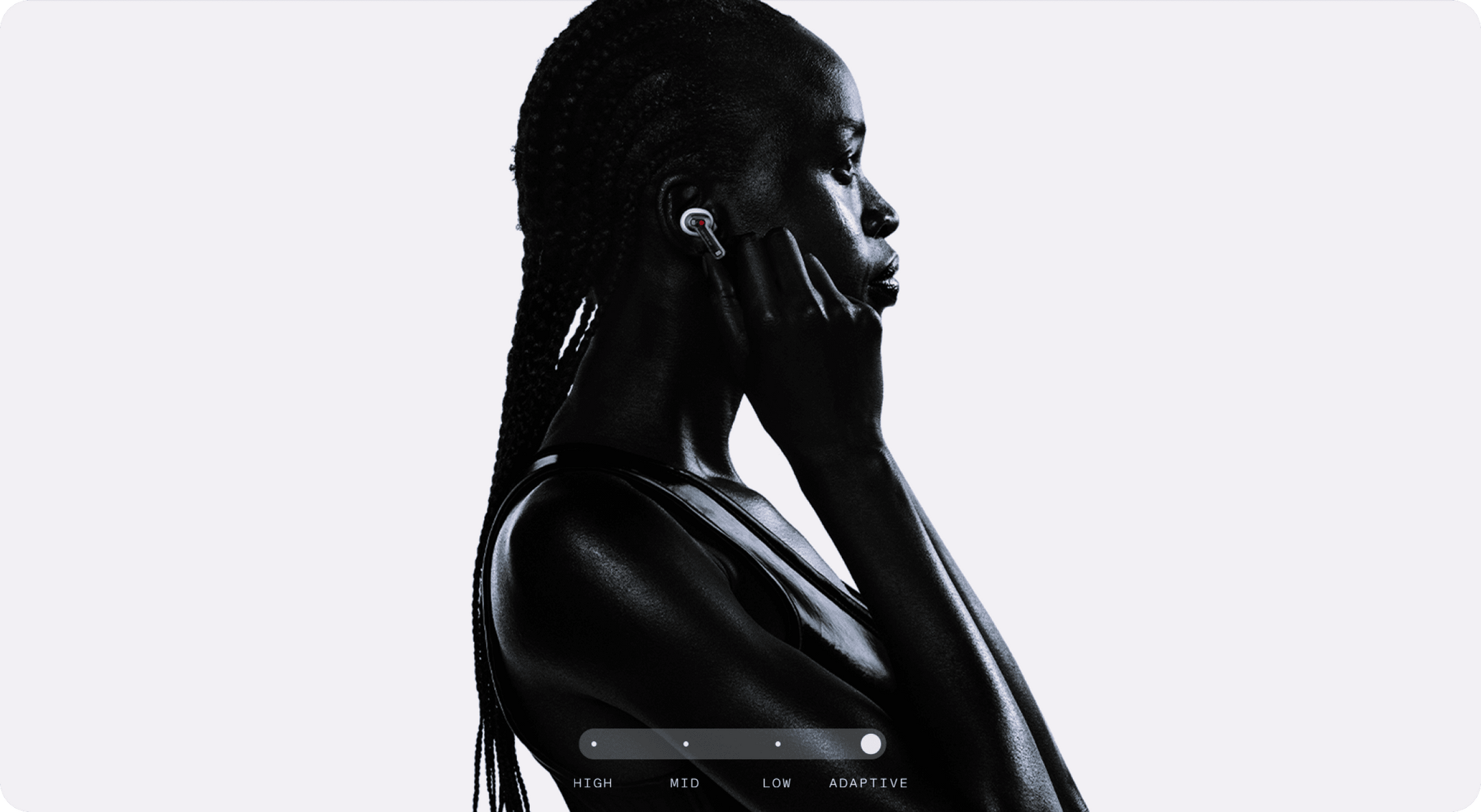 Next-level escapism. Switch between 3 levels of noise cancellation. Or let Ear take control. By selecting 'Adaptive' in the Nothing X app, Ear automatically applies the right level of noise cancellation according to your surroundings in real time, so you don't have to.